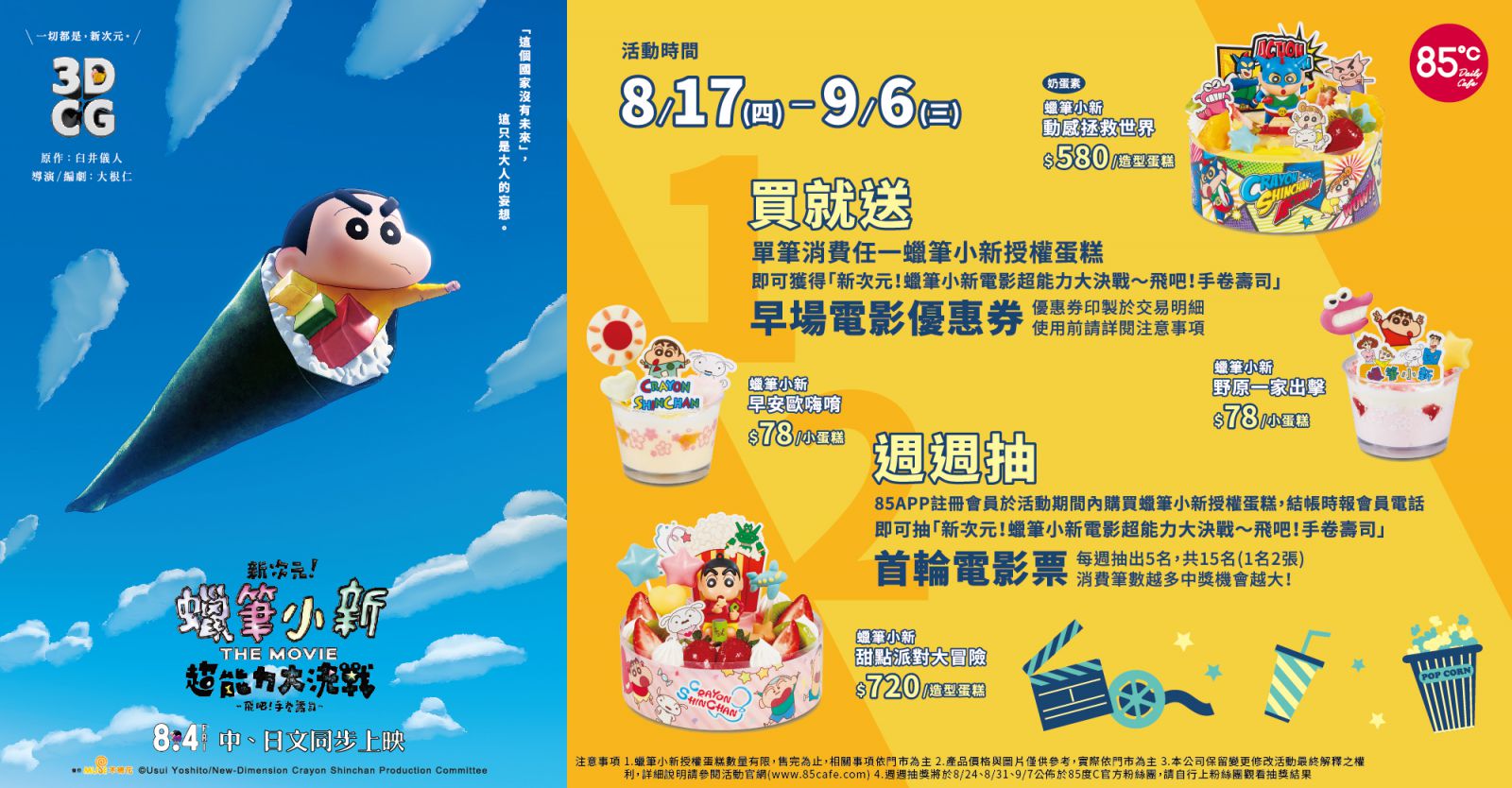 而「85度C」推出蠟筆小新蛋糕!想要重溫童年,感受獨特的蠟筆小新魅力,那就別再猶豫了!8月17日至9月6日只要到85度C消費任一款蠟筆小新授權蛋糕,就能獲得《新次元!蠟筆小新電影超能力大決戰~飛吧!手卷壽司》電影早場優惠券。而成為85APP會員,在活動期間購買蠟筆小新授權蛋糕,還有機會抽中首輪電影票,買蛋糕再抽好禮,一起進入小新的奇妙世界,快到85度C搶先預約吧!