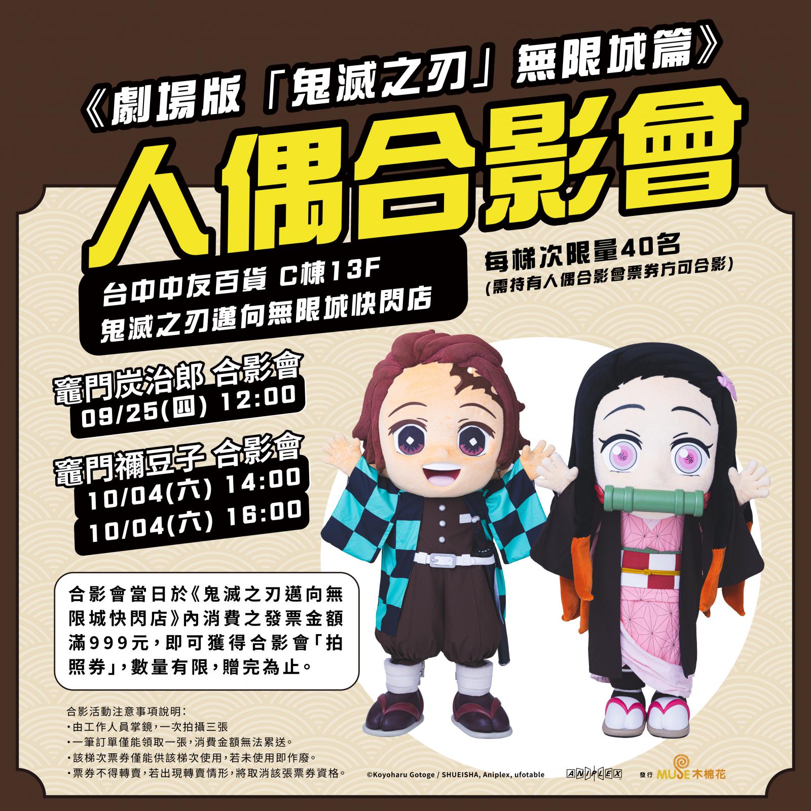 為響應全台鬼滅熱潮,《劇場版「鬼滅之刃」無限城篇》快閃店於 9 月 25 日至 11 月 2 日在台中中友百貨 C 棟 13 樓國際大廳登場,現場除了提供最新周邊商品,更加碼將全台灣唯一的鬼滅之刃戰鬥拍照場景,無限列車篇中炭治郎使出「火之神神樂 碧羅之天」,超大型的震撼火焰與跟列車同化的頸骨真實呈現在快閃店中,絕對是粉絲不可錯過的必拍打卡造景,活動期間更規劃限定人偶合影會,9 月 25 日由「炭治郎」率先登場,10 月 4 日則由「禰豆子」接棒亮相舉辦兩日共三場的人偶合影會。凡於當日購買快閃店商品滿 999 元,即可獲得合影資格,每梯次限量 40 名,粉絲千萬別錯過與人氣角色近距離互動的難得機會。
