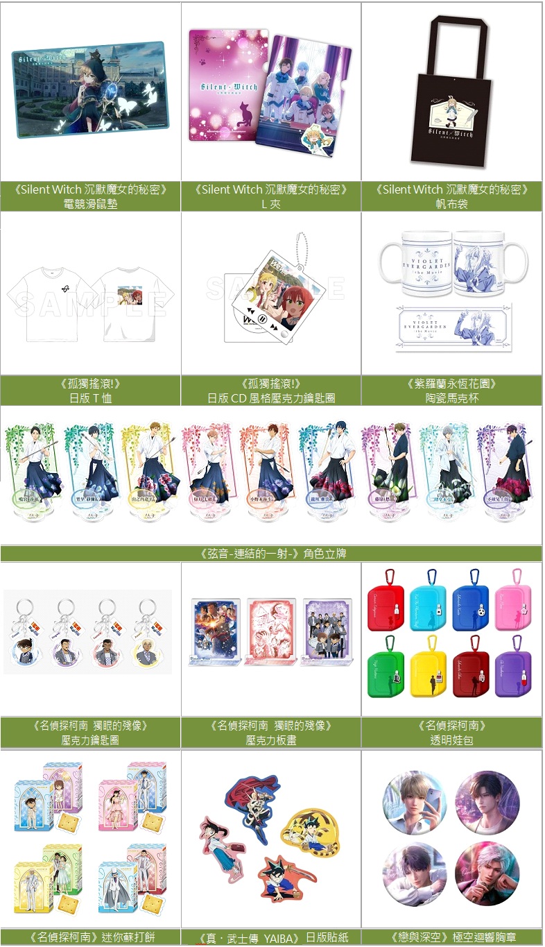被喻為本季最強動畫之一的《Silent Witch沉默魔女的秘密》以清新風格跟松鼠系女主角廣受喜愛,這次特別帶來最可愛的莫妮卡T恤、帆布袋、長門簾等商品,還有包含學生會成員在內的L夾,現貨到場免預購!今年電影大熱門《名偵探柯南 獨眼的殘像》熱門商品推推!日版迷你色紙、台版鑰匙圈等商品,都能看到角色充滿魅力的一面,同樣誕生自青山剛昌老師筆下的熱血經典《真・武士傳YAIBA》,也推出日版閃閃胸章及貼紙等全新商品。《孤獨搖滾!》本次將帶來演唱會「We will」關聯商品,包含日版B2海報、CD風格壓克力鑰匙圈、演唱會T恤等,即使演唱會結束,這些商品還是能伴你身邊繼續Rock哦!