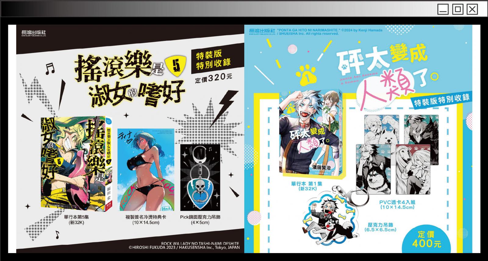 長鴻本次推出會場限定特典——現場購買《砰太變成人類了。》、《獨佔接班人:His Love, His Redemption》一本,《怪獸8號》、《搖滾樂是淑女的嗜好》、《想逃家的我、不小心把憧憬的大魔法使買下來了》特裝版任一本或單行本任兩本,即送該作品特典卡乙張。購買《獨佔接班人:His Love, His Redemption》單行本除了贈送特典卡以外,還有加碼贈送超可愛的Q版胸章!