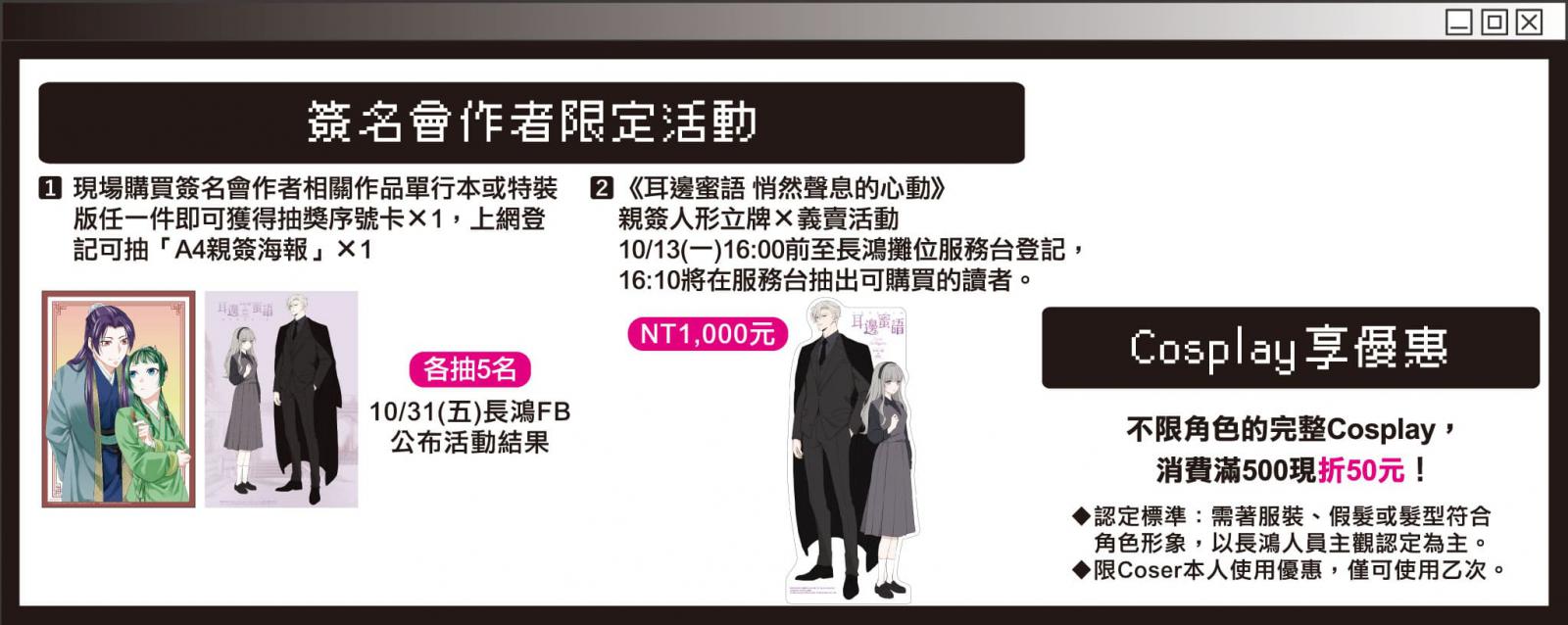 另外還有《耳邊蜜語 悄然聲息的心動》的親簽人形立牌義賣活動,將在動漫節現場開放登記並抽出立牌購買資格。立牌義賣所得收入將全數捐出,活動捐款證明及捐贈單位會在活動結束後於長鴻出版社粉絲專頁公布,歡迎各位粉絲踴躍登記!