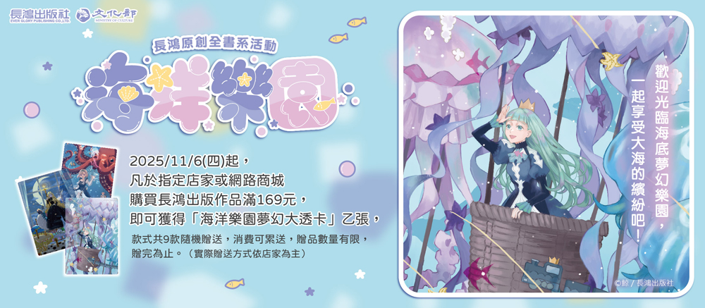 「海洋樂園」活動即將於2025年11月6日(四)正式開跑,長鴻出版社所有出版品都可參與活動,歡迎至活動網站查看參與活動之店家名單。此外,活動期間在長鴻出版社FB粉絲團,也將不定期釋出更多精彩資訊,敬請持續關注!