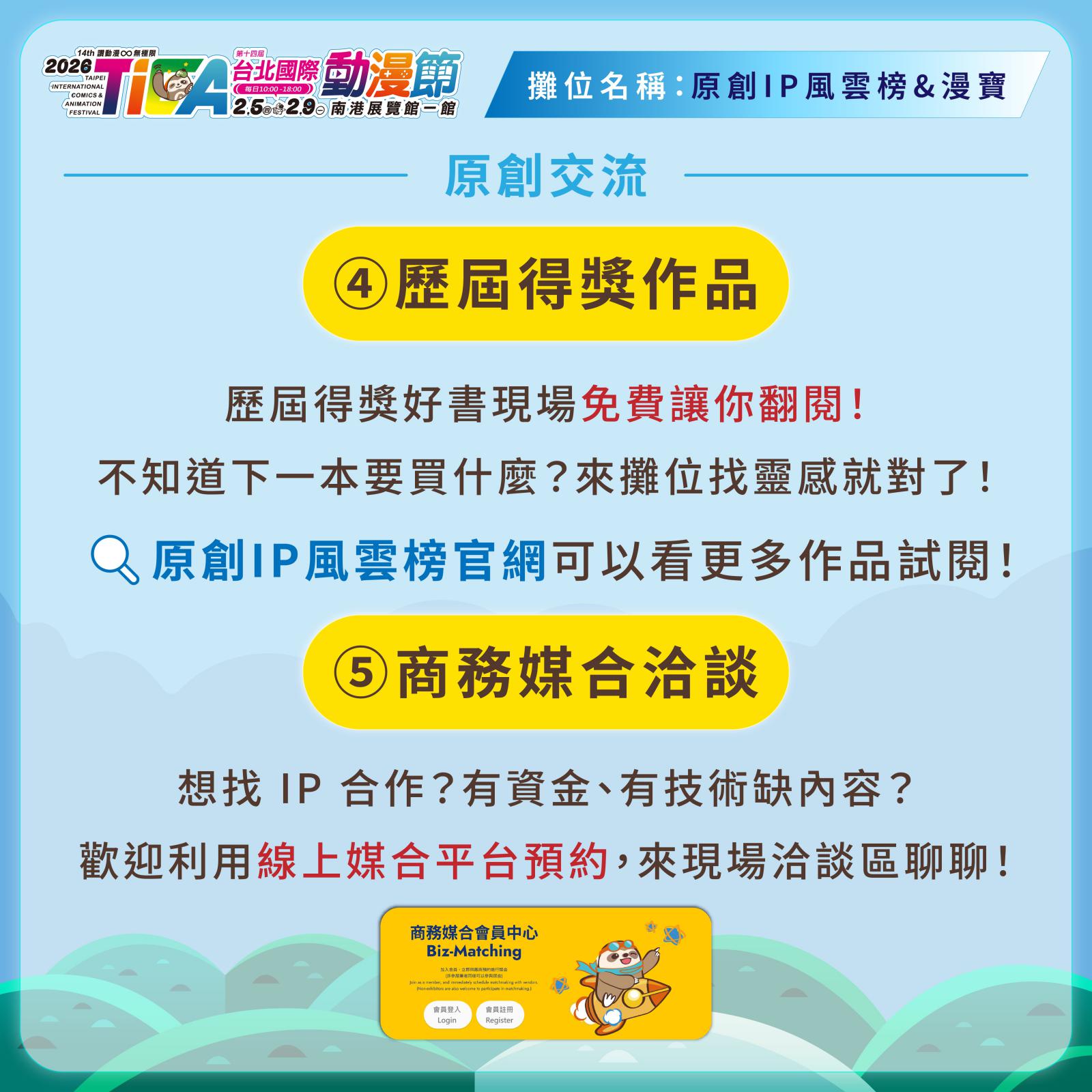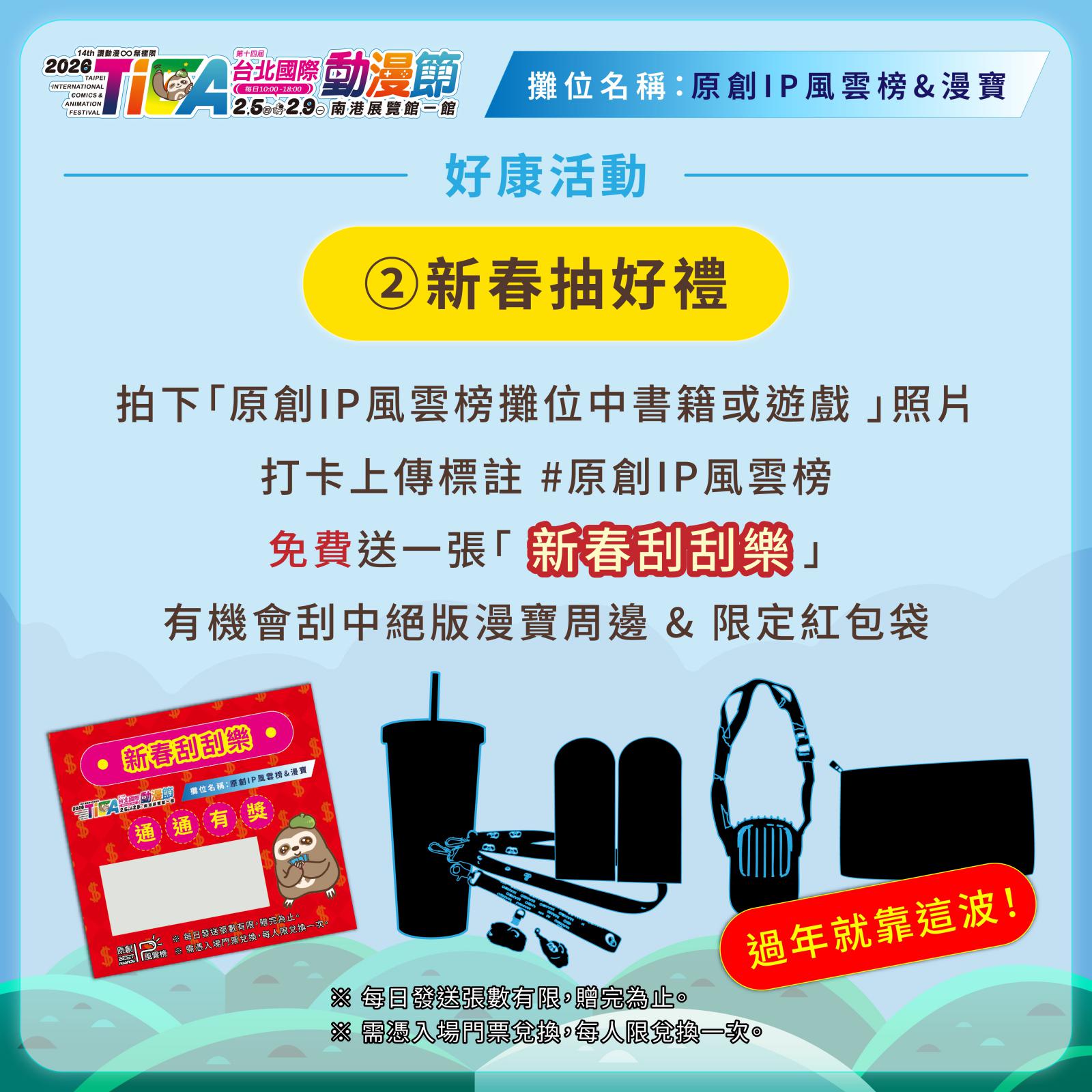 - 新春試手氣:拍照打卡刮好禮!配合農曆年節氣氛,攤位特別舉辦「新春抽好禮」活動。民眾只要拍下攤位上的書籍或遊戲,上傳社群打卡並標註 #原創IP風雲榜,即可獲得刮刮樂乙張。獎項包含限量漫寶周邊及新春紅包袋,張張有獎,歡迎大家來試試手氣。