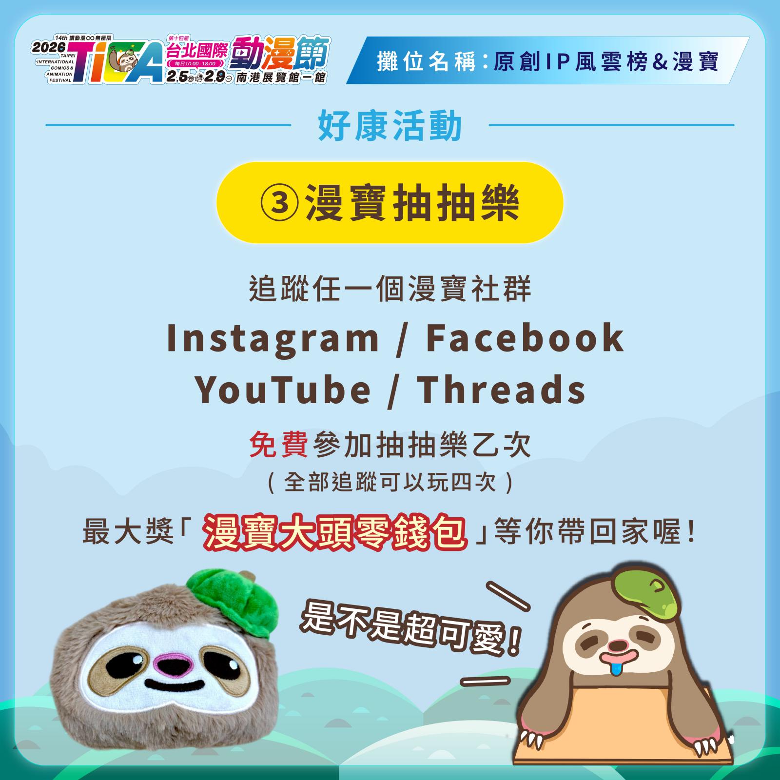 - 漫寶粉絲抽抽樂:人氣吉祥物「漫寶」也將在現場與大家互動!只要追蹤漫寶的任一社群平台帳號,即可參加抽獎,有機會獲得實用可愛的「漫寶大頭零錢包」。