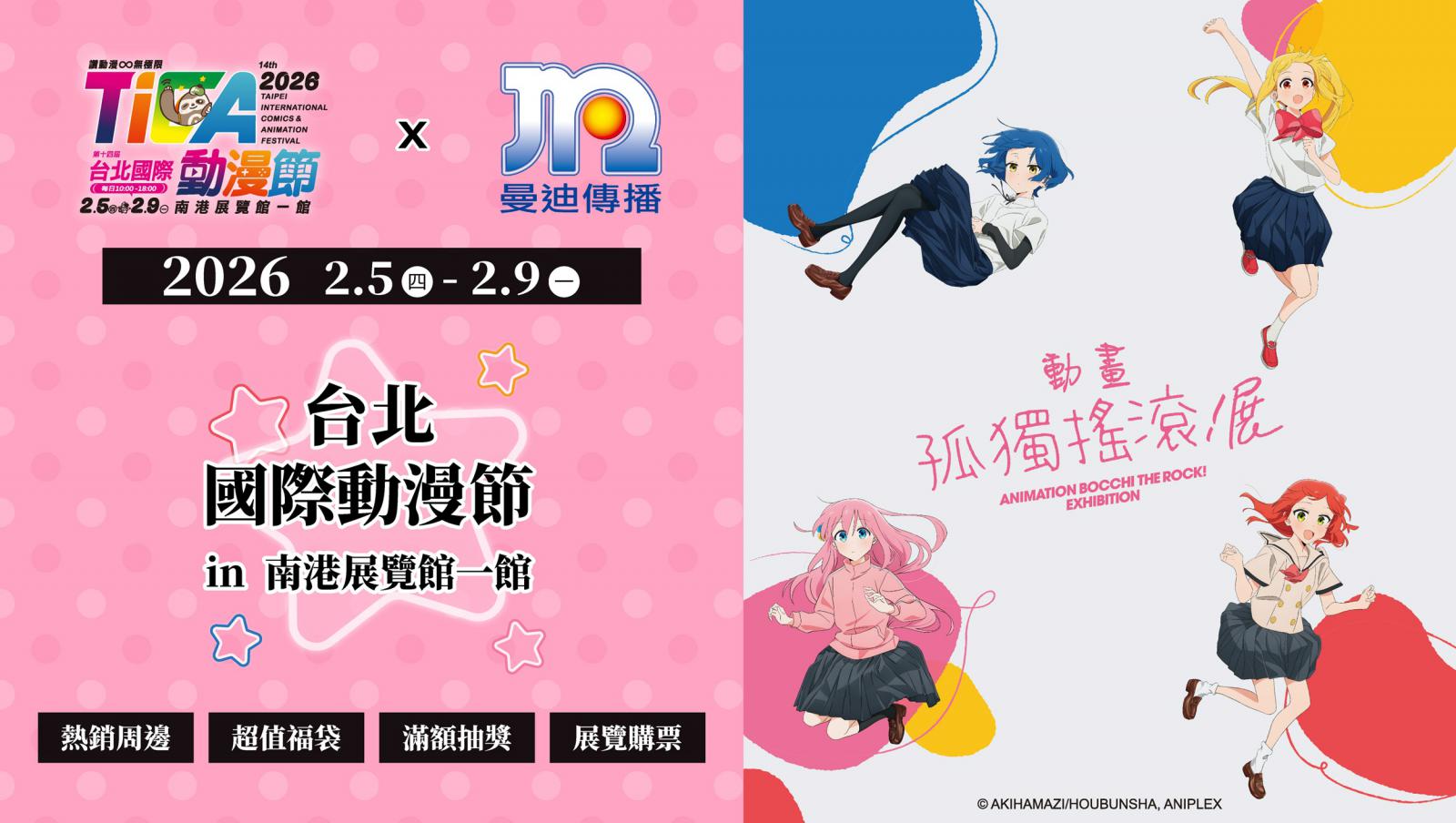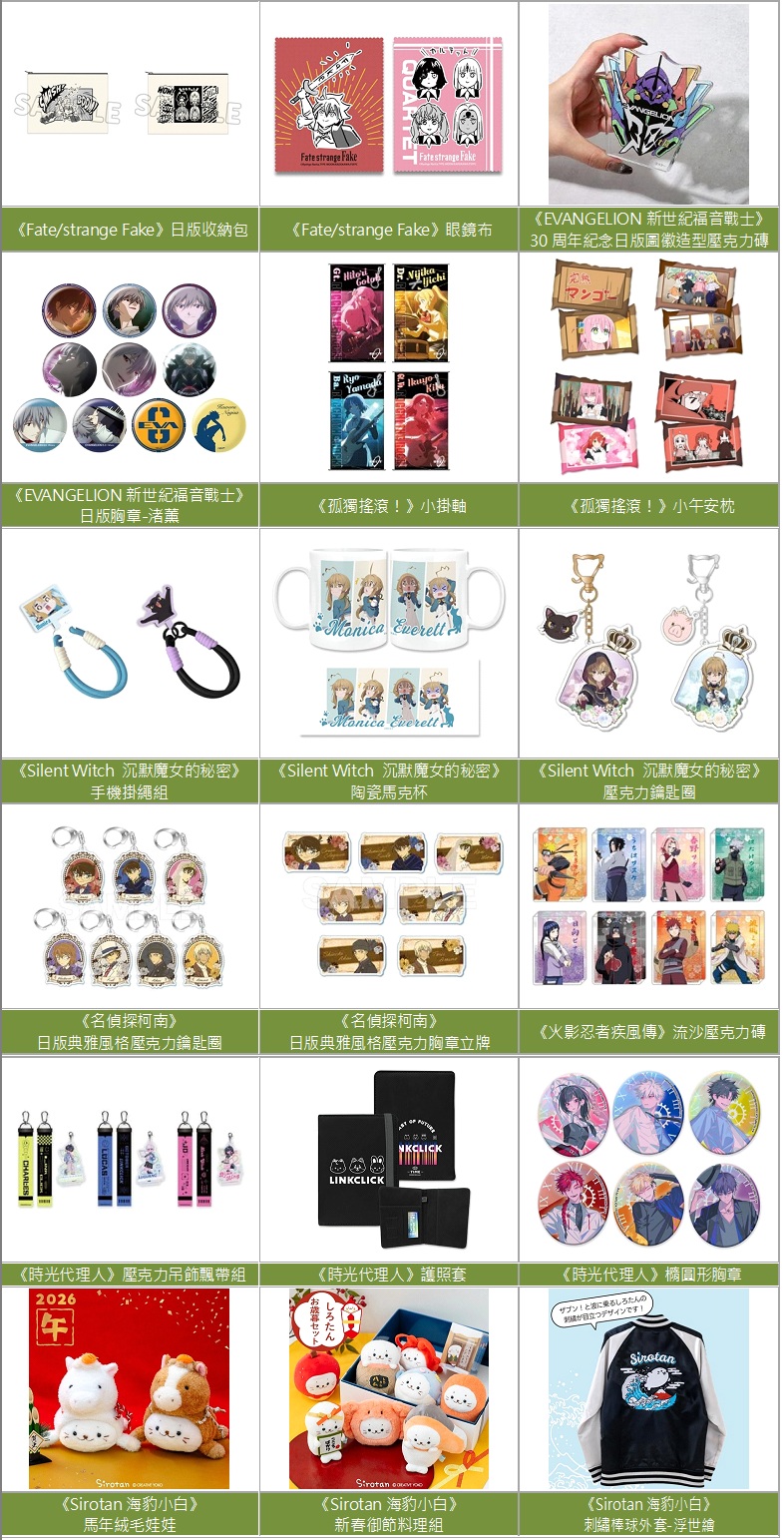 曼迪動漫新品全員集合!2026來台北國際動漫節,強作新番《Fate/strange Fake》與絕對經典《EVANGELION新世紀福音戰士》推出最新周邊及日版限定商品,以及大家最喜歡的《名偵探柯南》《Silent Witch 沉默魔女的祕密》《孤獨搖滾!》《紫羅蘭永恆花園》《火影忍者疾風傳》《時光代理人》等人氣周邊,超過1500種動漫周邊同場集結,更推出9款超值福袋,袋袋半價起跳超划算,現場再開賣《孤獨搖滾!》動畫展及《東京卍復仇者展 最後的世界線》特典套票,想要的一次買齊,滿額再享多重好禮,讓你心滿意足過好年!