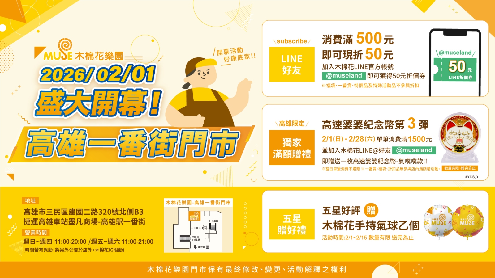 活動日期:2月1日至2月15日,開幕首兩週,只要在門市留下五星好評,即可免費獲得MUSE木棉花手持氣球乙個,送完為止。