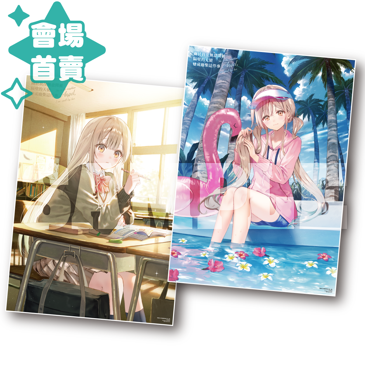 簽名會作品《惡靈剋星》除隨機商品外也推出了其他精品,以精美圖樣搭配美術紙製作的A4畫報與特別以燙金工藝加工的珍藏壓克力磚,完美呈現作者的細膩彩圖,是絕對要收藏的品項。同樣為簽名會作品的《敗北女角太多了!》則是有以精美圖樣搭配美術紙製作的A4畫報,再加上以作品內文藝社社刊為發想的筆記本,還原作品細節外更挑選了可愛的彩圖,收藏性與實用性並具。大受矚目的校園戀愛作品《關於我在無意間被隔壁的天使變成廢柴這件事》將發行以特殊工藝製成的A3海報組,一張為銀箔材質,另一張則為PP材質,絕對值得收藏!最後,當季熱門動畫《葬送的芙莉蓮》則是史無前例地推出會場加購商品,以大尺寸製作的特製畫板,所選圖面具有意義之外,更特別申請了兩位作者的複製簽名置於畫板上,只要現場購買《葬送的芙莉蓮》系列書籍或商品即可加購!