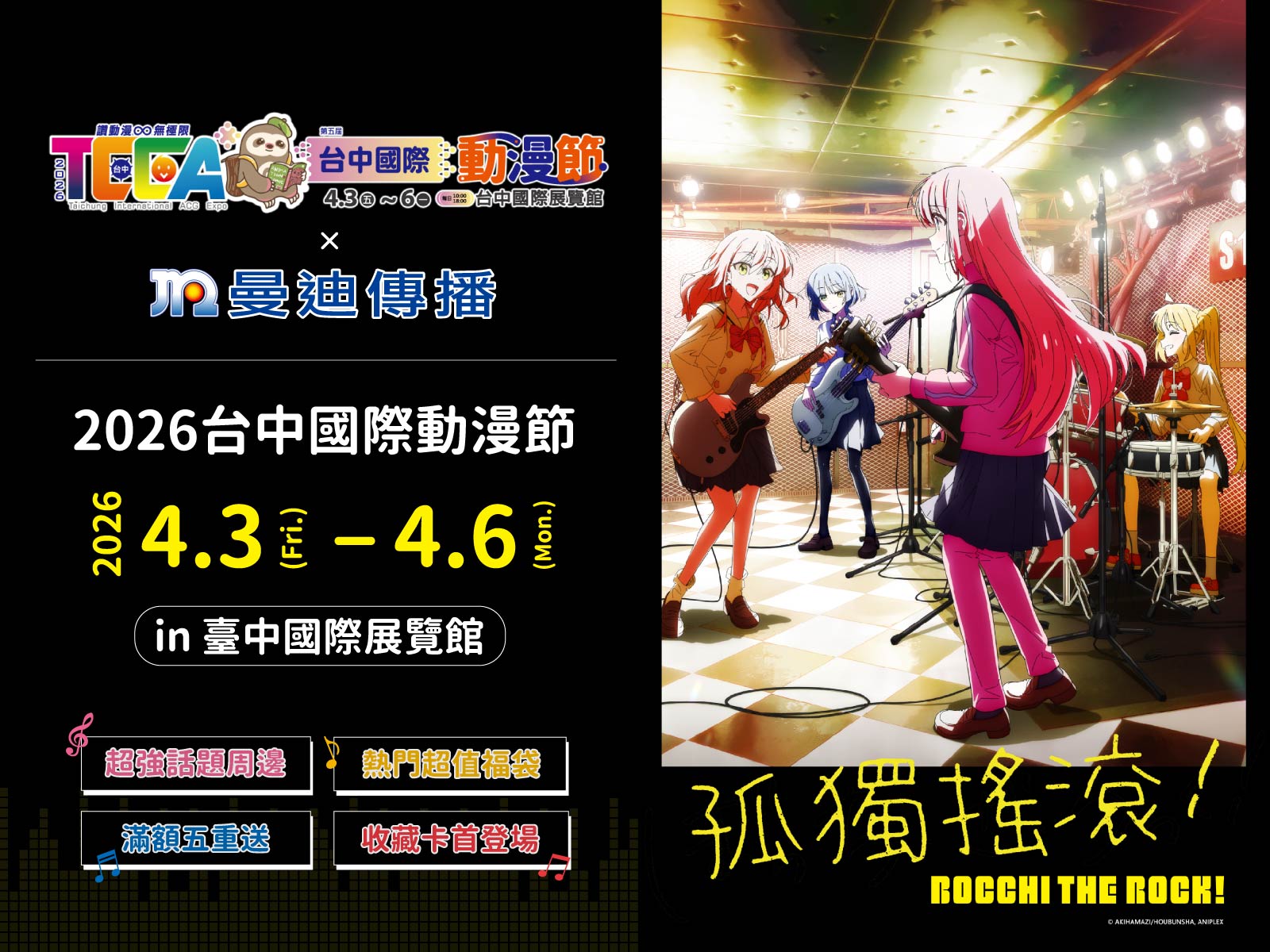 4/3-4/6台中動漫節即將登場!曼迪傳播將帶來《孤獨搖滾!》《名偵探柯南》《Fate/strange Fake》《Silent Witch沉默魔女的秘密》《時光代理人》《戀與深空》等知名作品周邊,超過1500樣商品、5款限定福袋、以及滿額好禮五重送等活動,給動漫迷好逛又好買的最佳選擇,更首度於台中推出《孤獨搖滾!》全新抽卡機台,讓小孤獨陪你試手氣,多款美圖帶回家!