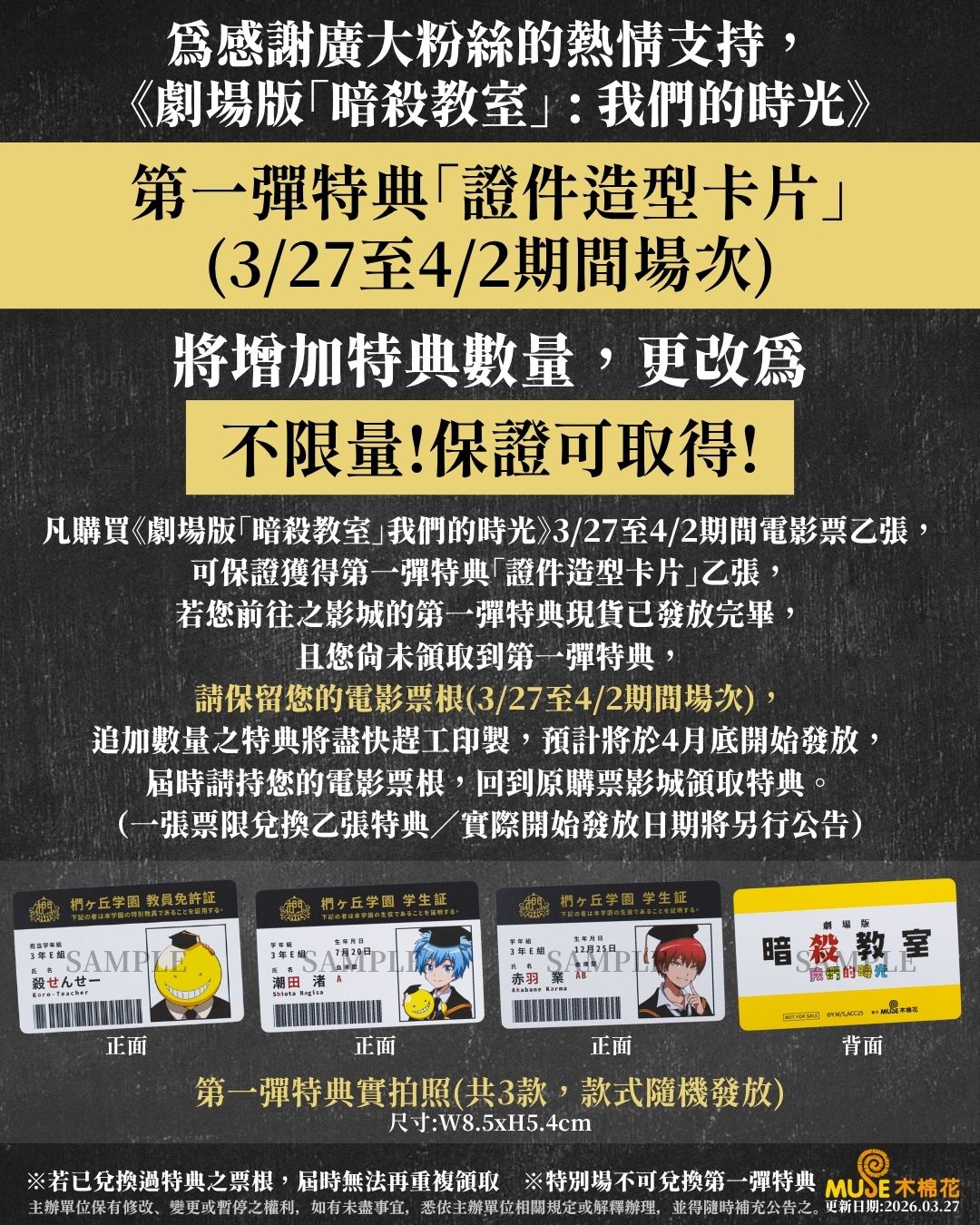 電影發行商木棉花也特別感謝影迷們對《劇場版「暗殺教室」:我們的時光》的支持。凡於 3 月 27 日至 4 月 2 日期間購買本片電影票乙張,即可獲得第一週入場特典「證件造型卡片」乙張。尚未領取特典的觀眾,請保留該期間電影票根,追加特典發放資訊請關注木棉花社群公告。