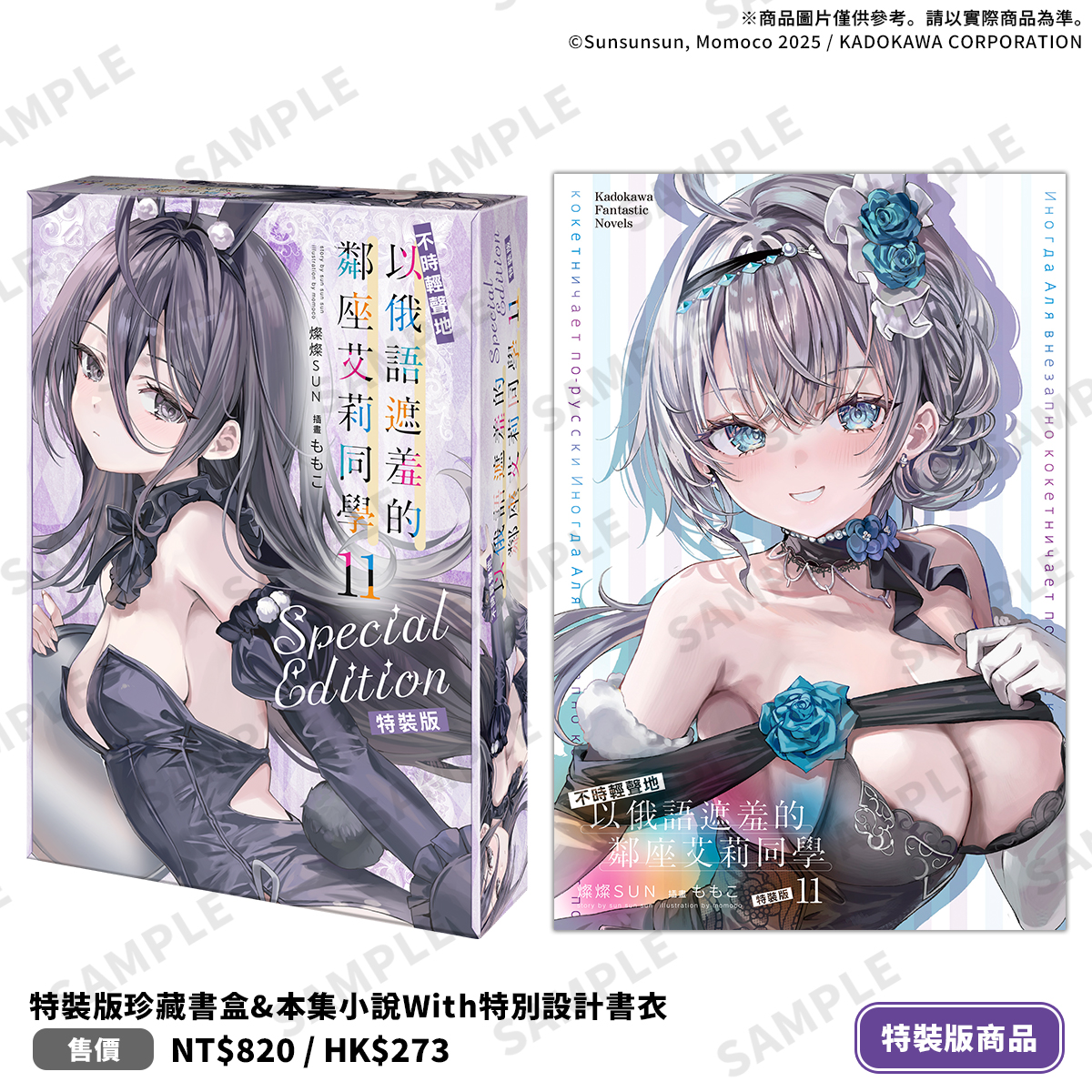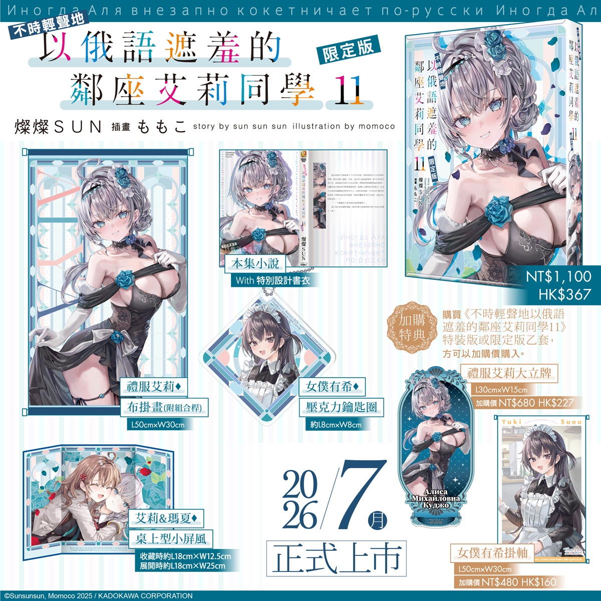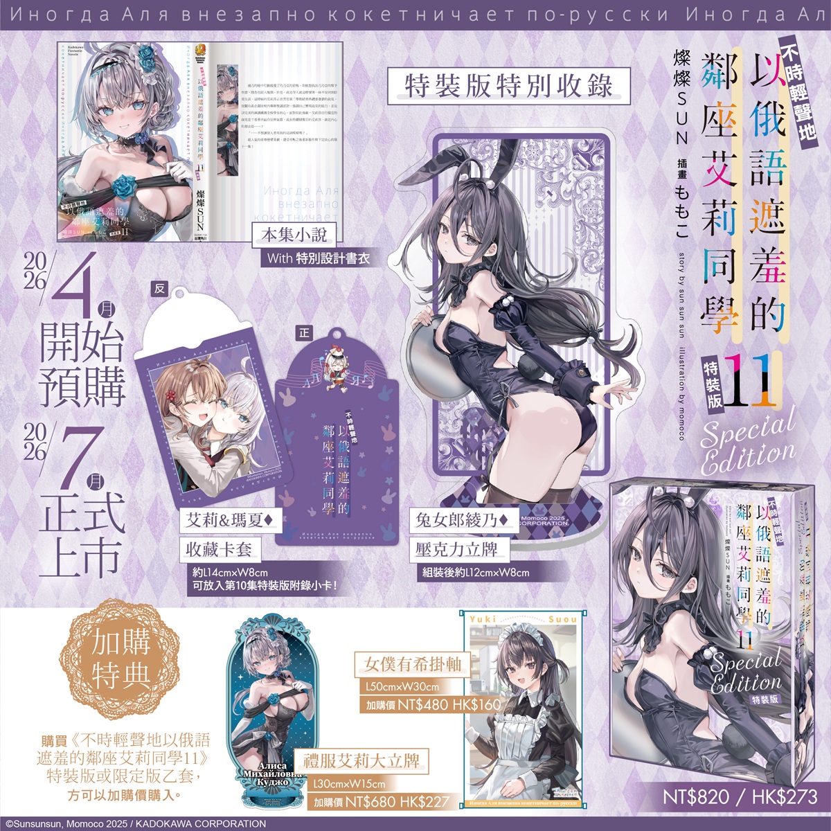 《不時輕聲地以俄語遮羞的鄰座艾莉同學 (11)》特別規劃限定版與特裝版,打造豪華雙版本周邊:【特裝版】開放指定通路&台灣角川官網預購/販售,2026漫畫博覽會首賣登場──收錄「艾莉&瑪夏◆收藏卡套(可放入第 10 集特裝版附錄小卡)」、「兔女郎綾乃◆壓克力立牌」;【限定版】將於2026漫畫博覽會獨家首賣,台灣角川官網限定發售──收錄「禮服艾莉◆布掛畫(附組合桿)」、「艾莉&瑪夏◆桌上型小屏風」、「女僕有希◆壓克力鑰匙圈」;雙版本皆收錄「本集小說 with 特別設計書衣」於兩款絕讚設計的「特製珍藏書盒」中。