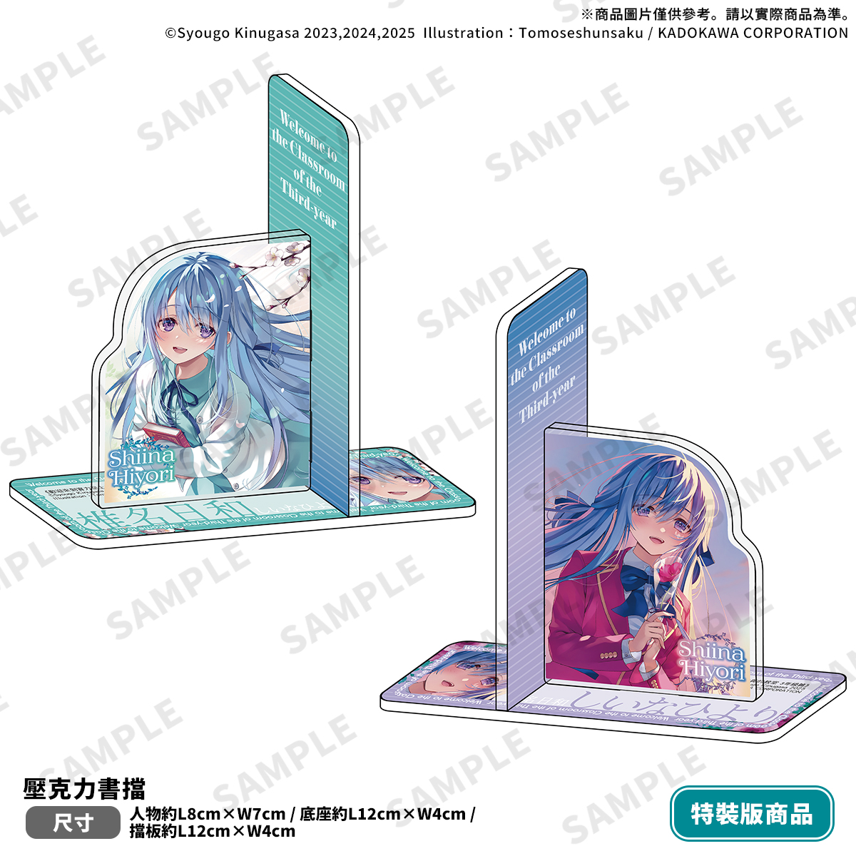 《歡迎來到實力至上主義的教室 3年級篇 (2)》特裝版以人氣女神「椎名日和」為視覺主體,收錄多款特典 :「壓克力書擋」以椎名日和兩款圖繪做設計,底座與擋板兼具美觀與實用功能;「桌上型小屏風」精美角色視覺圖點綴您的桌面與收藏櫃;「雷射胸章」特殊加工處理,憂鬱中的眼神更顯獨特魅力,並包含「本集小說 with 特別設計書衣」收錄於「特製珍藏書盒」中。