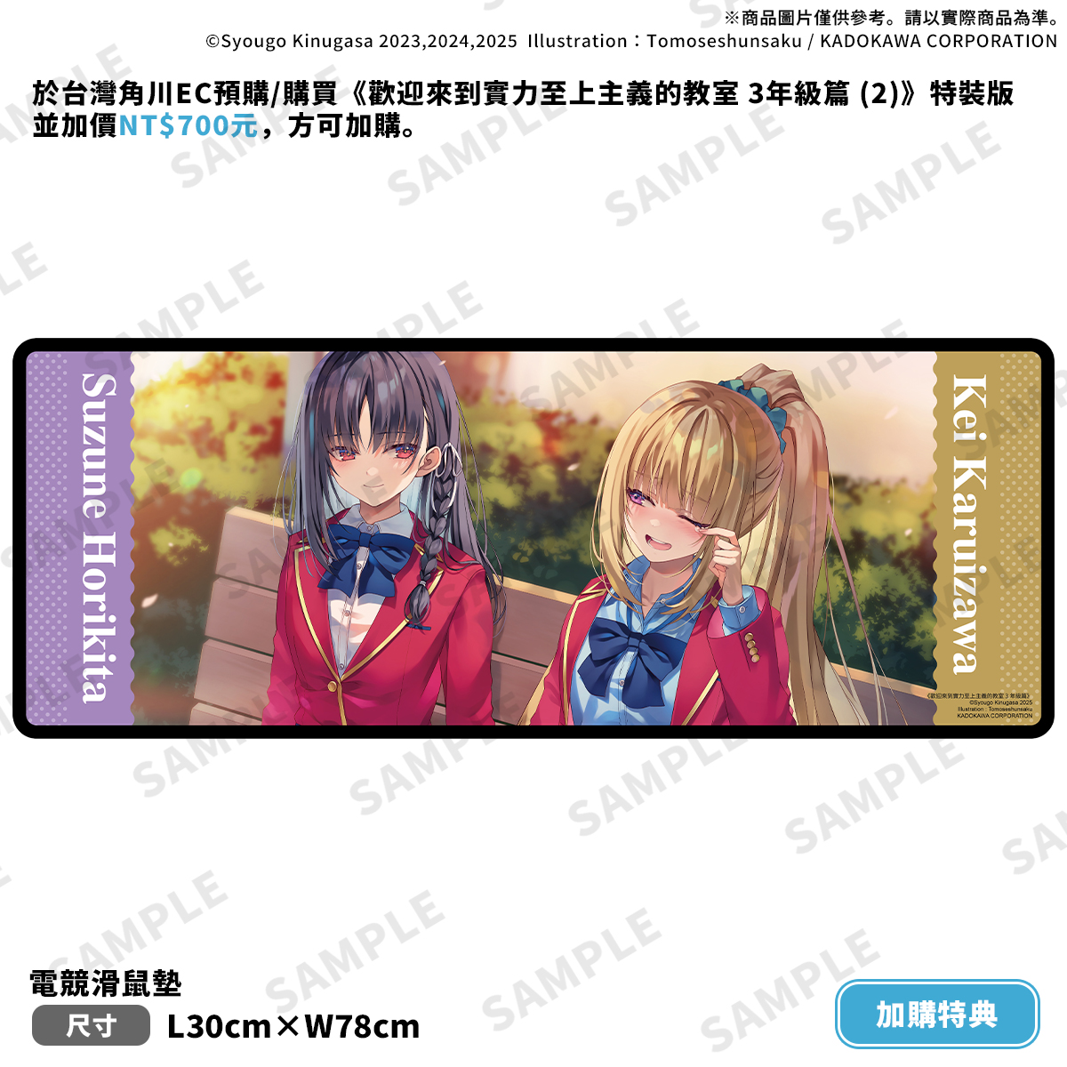 另外,本次也特別推出一之瀨帆波的「炫亮旋轉立牌」、台灣角川EC限定的堀北鈴音&輕井澤惠「電競滑鼠墊」兩款特典加購。凡預購、購買《歡迎來到實力至上主義的教室 3年級篇 (2)》特裝版即可加價入手。