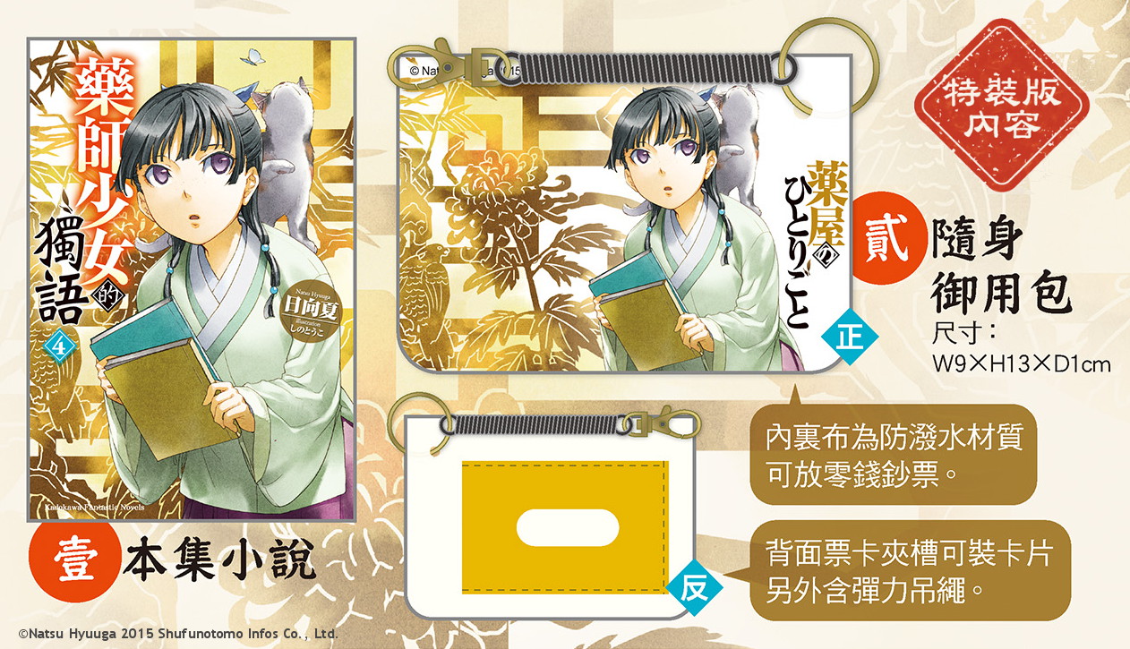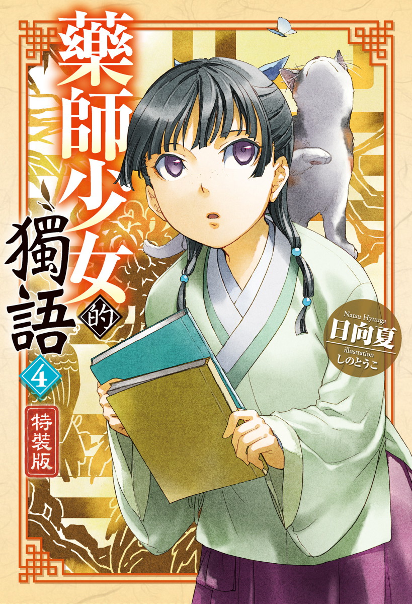 講述以中世紀東方為舞臺,原在煙花巷擔任藥師,而後意外成為試毒宮女的姑娘「貓貓」,雖然生性低調冷漠,但因其敏銳的觀察力及超高明醫術,經常被捲入明爭暗鬥的後宮之亂。大受好評的宮廷推理之作《藥師少女的獨語》第四彈即將登場!台灣角川將於2020動漫節推出輕小說《藥師少女的獨語 (4)》(特裝版),收錄台灣獨家特典「貓貓x貓貓 隨身御用包」,即日起開放官網預購~2019/11/26(二)16:00截止,預購網址:https://is.gd/TMlpNM。