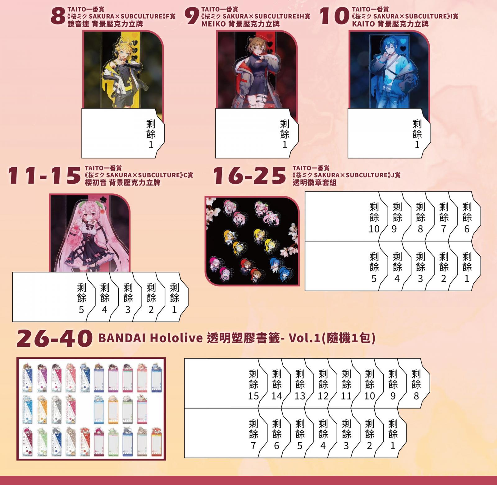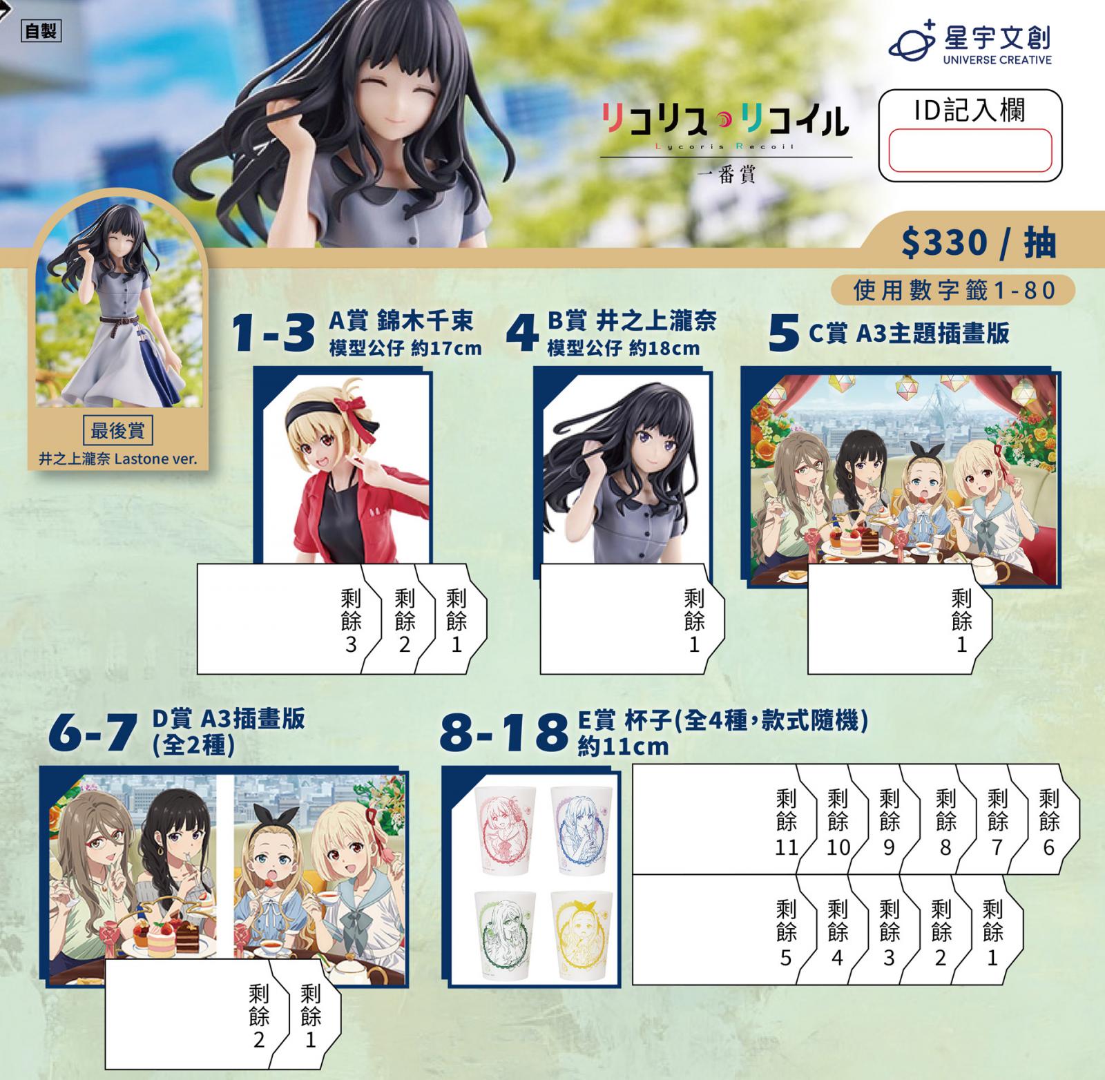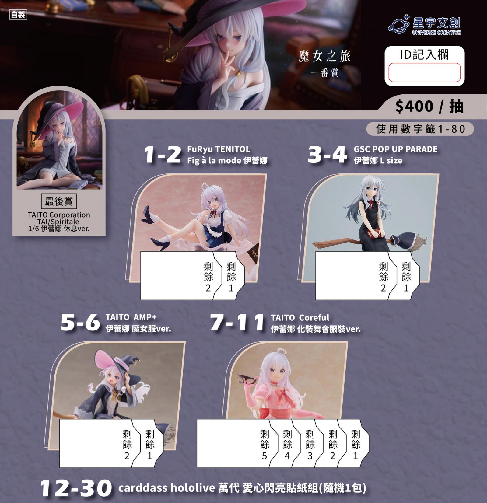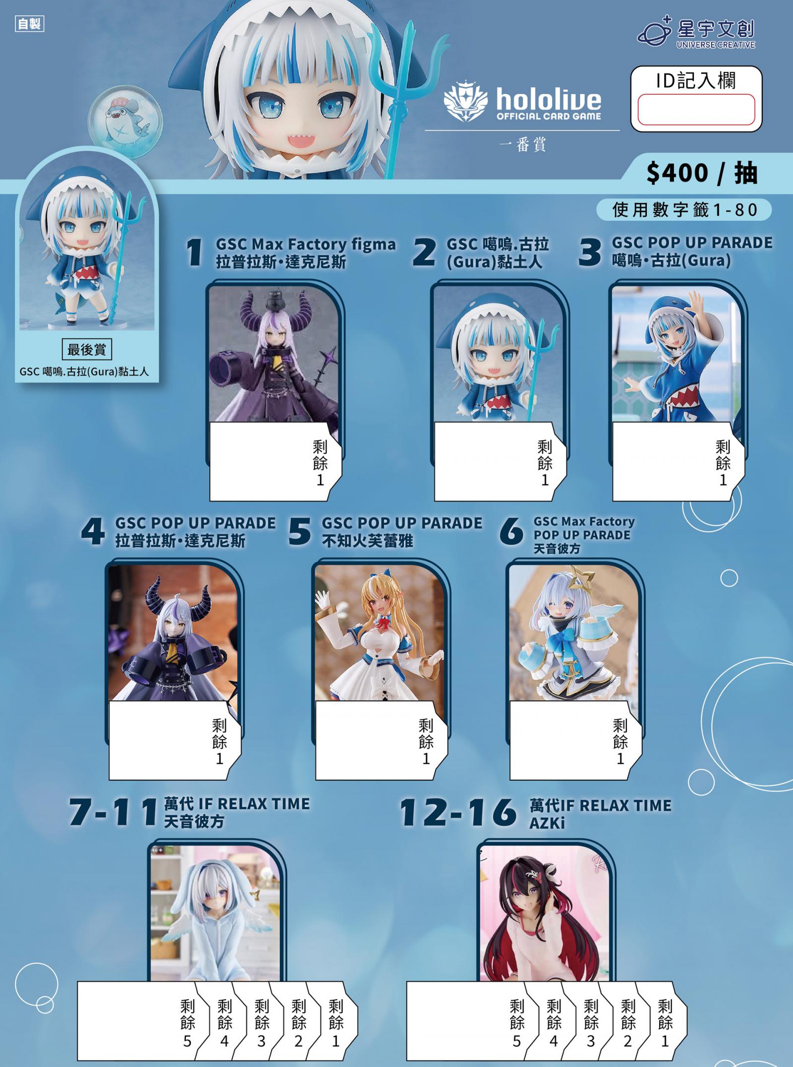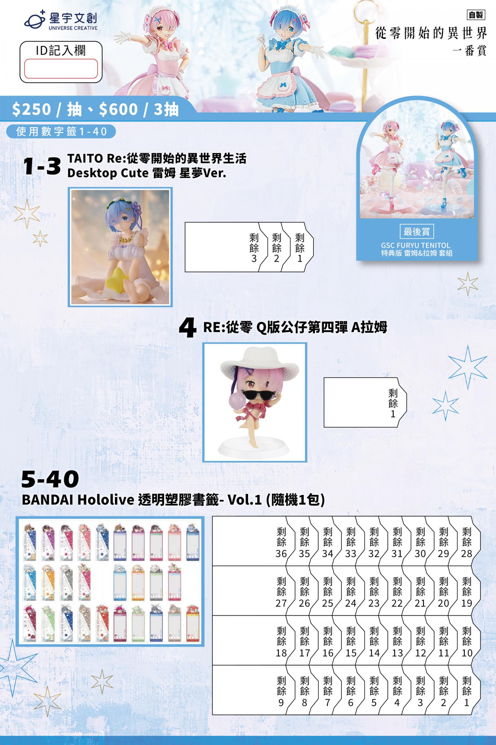 莉可麗絲、海賊王、Hololive、戀上換裝娃娃、魔女之旅、初音、狂三、雷姆、鏈鋸人、雅兒貝德等等現場有更多官方一番賞,轉珠帶來給大家好運