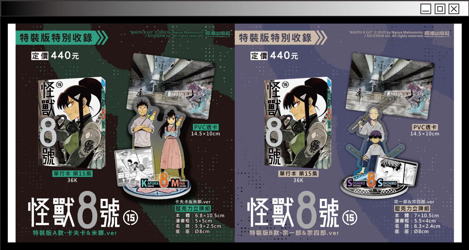 高雄動漫節首發松本直也《怪獸8號(15)》特裝版,本次推出兩個版本,分別是卡夫卡&米娜.ver以及宗一郎&宗四郎.ver。兩個版本的特裝皆內含單行本第15集、壓克力立牌組及PVC透卡。