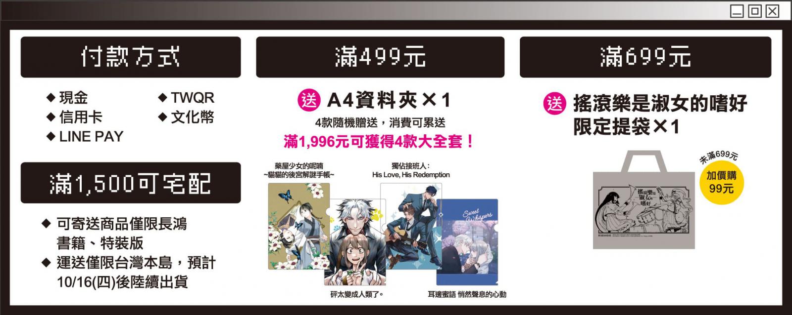 消費滿699元,即送「《搖滾樂是淑女的嗜好》限定提袋」乙個,若消費未達699元也可加價99元購買,此贈品單筆消費不可累積贈送,單筆消費發票限加購一次。只要消費超過1,500元就可從會場宅配到家(僅限台灣本島,宅配商品僅限特裝版、單行本及套書),買得再多也可以放心逛展!