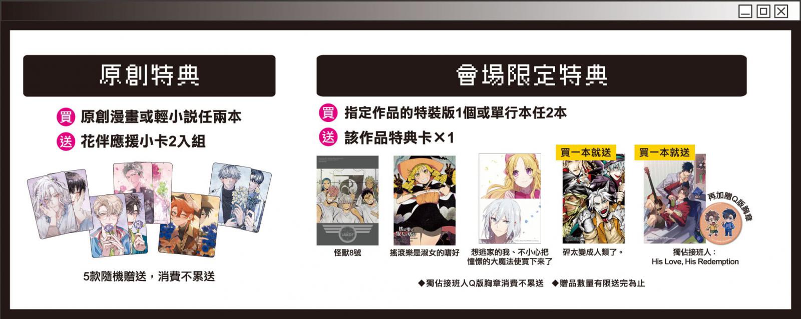 另外購買原創作品小說或漫畫任兩本,即送隨機花伴應援小卡2入組乙份,單筆消費不累送。以上特典數量有限,送完為止。