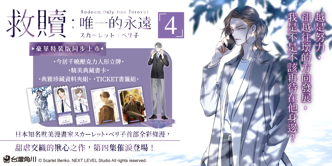 2026台中國際動漫節將於4月3日(五)至4月6日(一)在臺中國際展覽館盛大登場。台灣角川將推出日本超人氣漫畫家スカーレット・ベリ子創作的全彩BL條漫《救贖:唯一的永遠》,內容講述千曉目睹戀人久遠意外身亡後,卻意外回到十年前,再次遇見性格迥異的年輕久遠。第四集中,財閥世家出身的要對千曉有著異樣的依戀。此時,看似平靜的日常卻接連出現變故,久遠被迫搬家,千曉在學校也遇到麻煩,這一切難道是要的「傑作」?