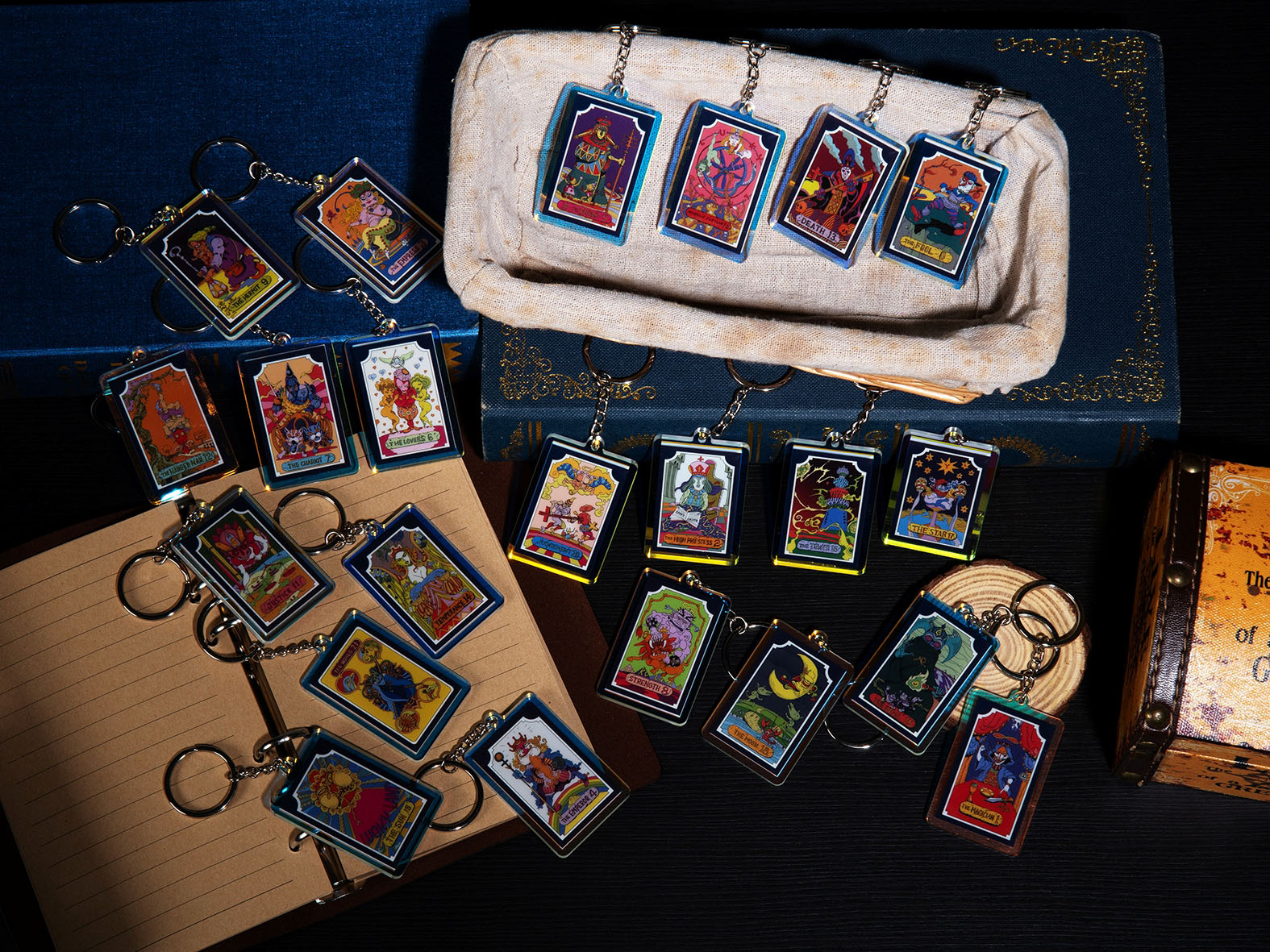 《JOJO 的奇妙冒險》星塵遠征軍中,充滿奇幻色彩的22張塔羅牌全員到齊,成為盲抽壓克力鑰匙圈,快來試試你命定的牌卡究竟是哪一張;更推出經典手札,以對應承太郎替身白金之星的「星星」牌及象徵DIO替身世界的「世界」牌作為封面封底,,內頁還包含多款塔羅牌與替身能力的設計。穿上有著《戀上換裝娃娃》喜多川海夢活力四射POSE的潮流T恤,一起感受青春戀愛的酸甜與心動。