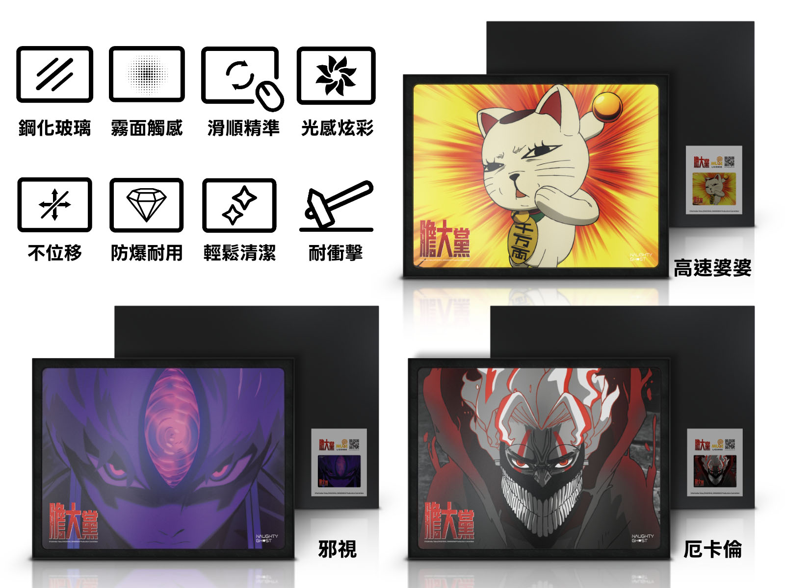《膽大黨》帶來鋼化玻璃電競滑鼠墊,以3mm物理鋼化玻璃加上表層AF奈米鍍膜,耐用抗衝擊又疏水疏油;磨砂霧面處理,提供控制精準的滑順觸感;永不掉色的UV光感炫彩印刷,讓角色層層分明細膩清晰。高速婆婆、厄卡倫、邪視三款,都能讓你擁有精準掌控的極速體驗。