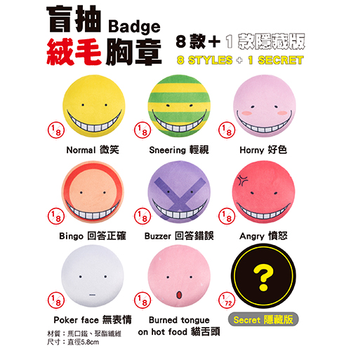《暗殺教室》盲抽絨毛胸章(全9款) NT$120/款 尺寸:直徑5.8cm
