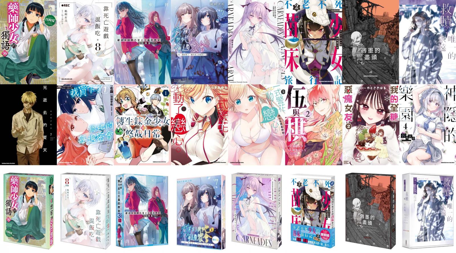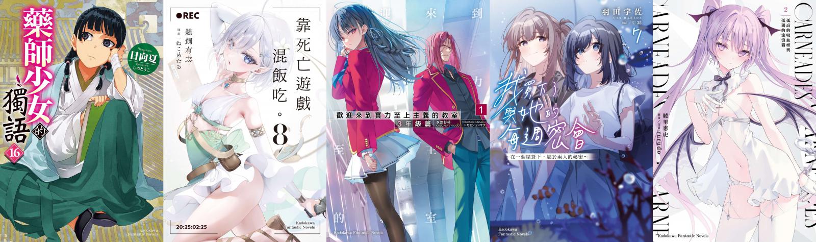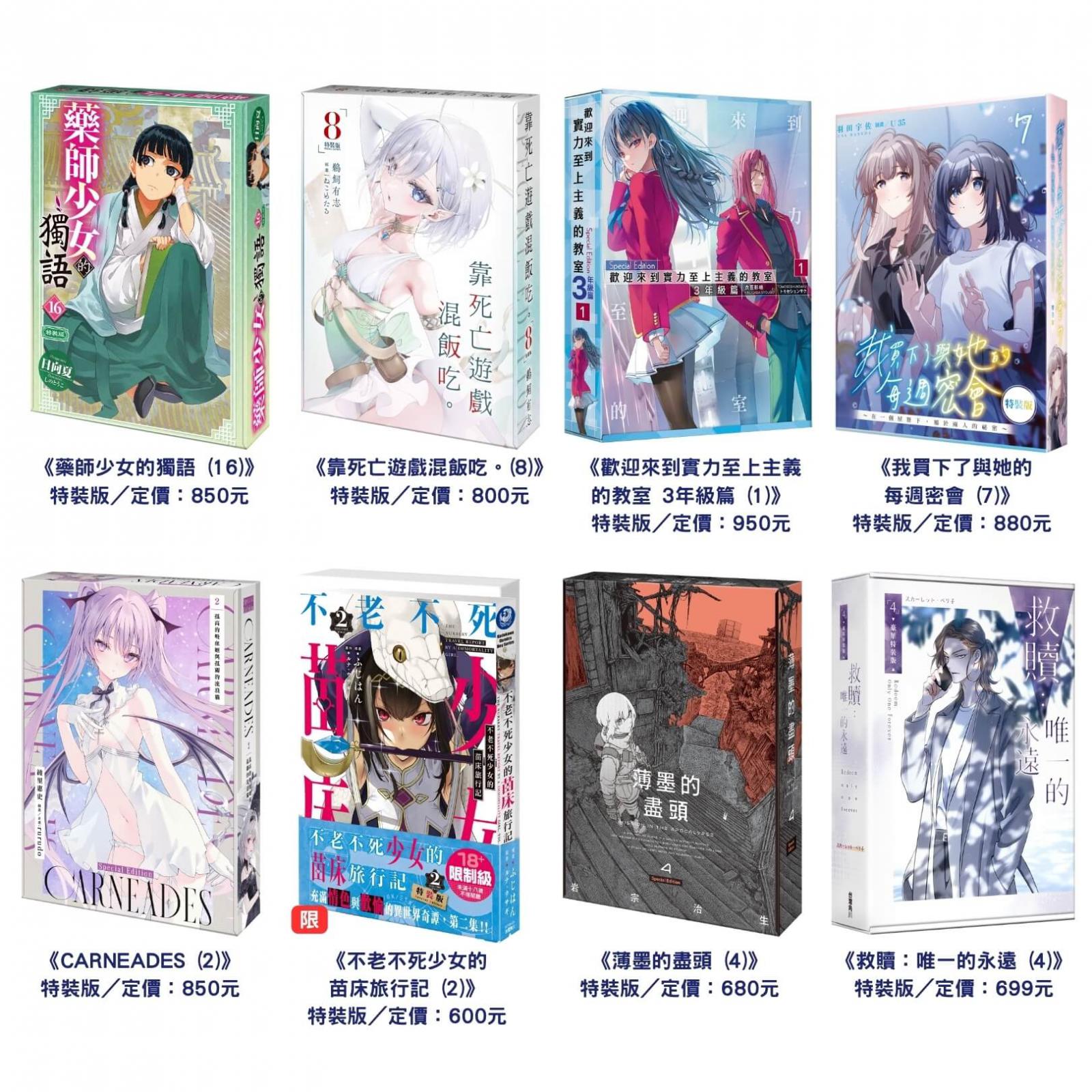 本次台灣角川推出多款極高收藏價值的特裝版作品。小說部門由現象級IP領軍的豪華特裝版陣容──包含宮廷推理巔峰,全球銷量突破4,000萬冊的 《藥師少女的獨語 (16)》;榮獲「這本輕小說真厲害!」多項冠軍的《歡迎來到實力至上主義的教室 3年級篇 (1)》正式開啟全新篇章;話題新番動畫,美少女們挑戰殺戮遊戲《靠死亡遊戲混飯吃。(8)》將帶領讀者進入「遊戲」的核心真相;百合迷必收話題作《我買下了與她的每週密會 (7) ~在一個屋簷下,屬於兩人的祕密~》見證大學生篇的全新關係;血色百合唯美氛圍獻上視覺饗宴《CARNEADES (2) 孤高的吸血姬與孤獨的流浪貓》,多部新刊強勢來襲!