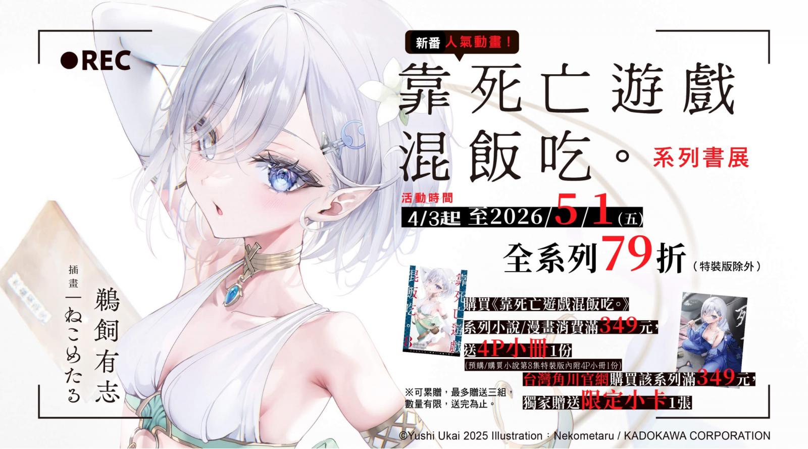 除了超強新作陣容之外,新番人氣動畫《靠死亡遊戲混飯吃。》系列書展,也將自4/3起於台中國際動漫節、台灣角川官網、各大通路同步開跑。凡於指定活動通路購買本系列作品可享 79 折優惠(特裝版除外),於實體通路購買《靠死亡遊戲混飯吃。(8)》小說特裝版,或是購買任2本系列輕小說&漫畫;於網路通路消費系列輕小說&漫畫滿349元,加贈《靠死亡遊戲混飯吃。》「4P小冊」乙份;台灣角川官網獨家贈「限定小卡」乙張,贈品數量有限送完為止,書展詳細活動辦法請見各大通路說明。